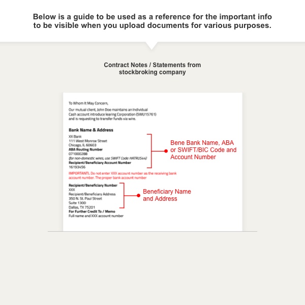You will be able to find this information in the contract note or statements issued by the investment or stockbroking company to which you are making payment. This will be uploaded as a supporting documents. Click here to view a sample.
