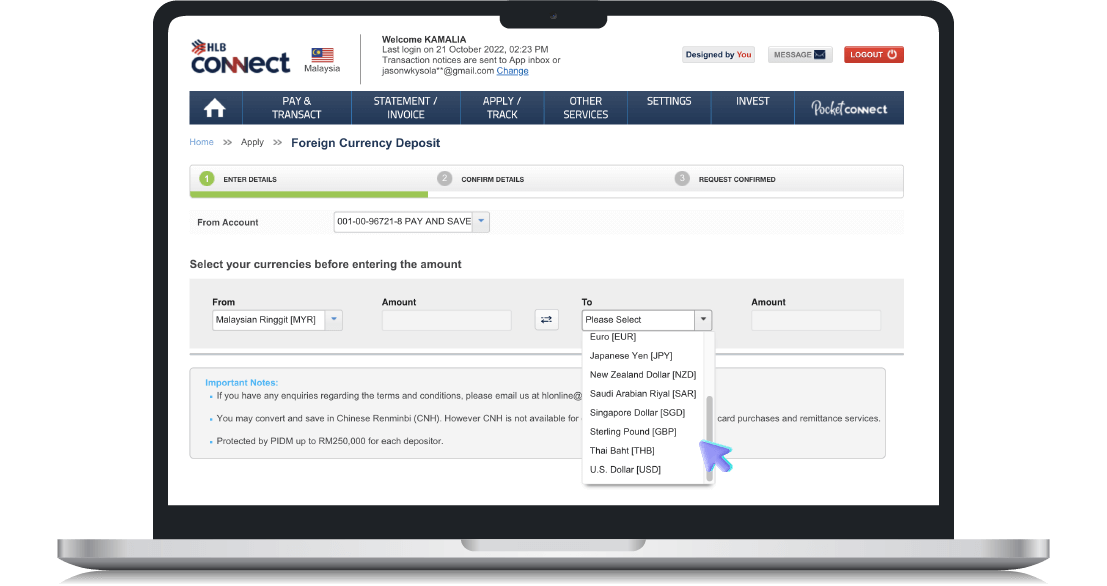 Sila log masuk ke HLB Connect untuk Deposit Mata Wang Asing dan kadar forex sebenar.